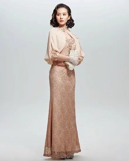 同色披肩袖的设计,脖颈处同样嵌着繁复的绣花珠饰,更加凸显出少女天鹅颈的优势。服装最外层笼着一层蕾丝细纱,给这个看起来豆蔻年华的少女平添了一抹朦胧美感,增加了几分妩媚气息。