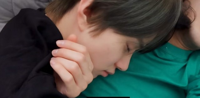 当时的动作是李马克张开手,然后蒋宁恩枕在李马克的肩膀上,然后手围着李马克。