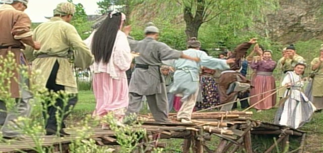 蓝枫倾飞身落在宁皇叔身边,再次挥出白绫,白绫缠上麻绳加固木头,直到行人全部过去俩人将白绫和麻绳系上树上。
