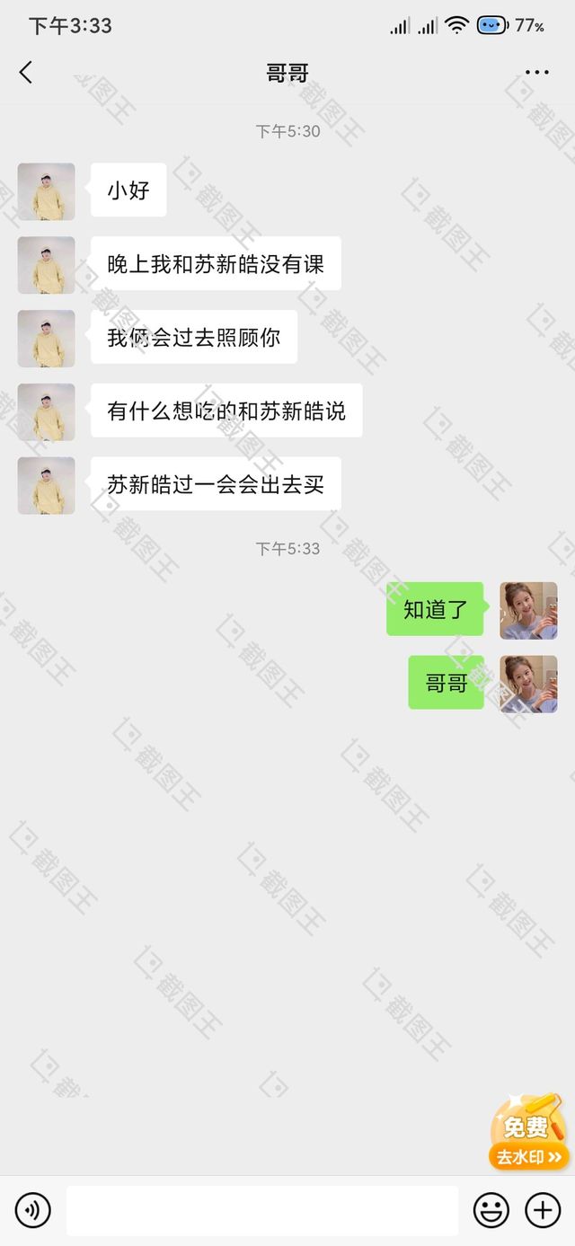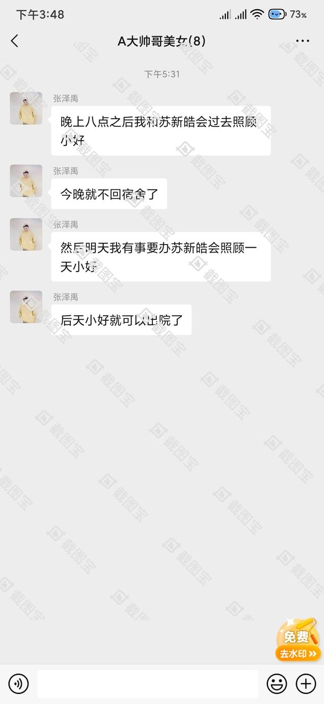 张珺好的这句话也让两人拿起手机点开微信大群看到张泽禹在大群里说到“晚上八点之后我和苏新皓会去医院照顾小好”