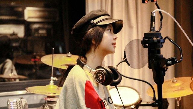 她选择了一件oversize的灰色卫衣,衣服前面有着一颗大红色的爱心和黑色字母,扎了个低马尾,戴了顶帽子,整个人都十分有活力。