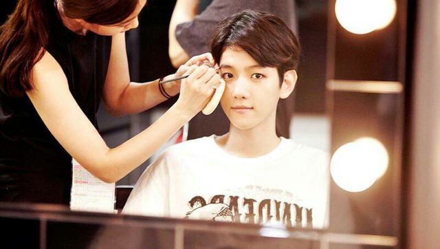 边伯贤乖乖的坐在凳子上让简时化着妆