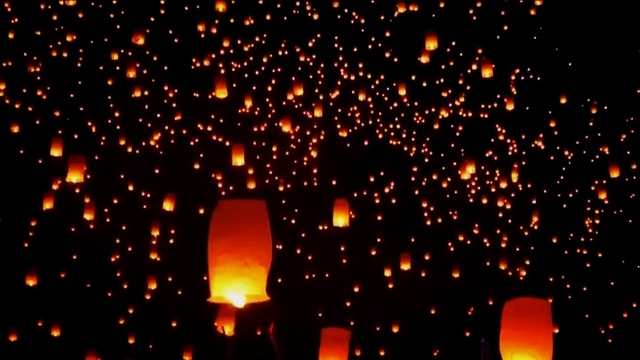 是一盏盏犹如繁星洒落天际的金色孔明灯在天际冉冉升起。