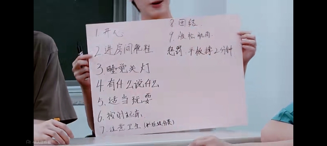 “接下来,我们在这边整一个假期都会一直生活在这里,一起进行培训进行学习。既然七个人一起生活的话,那一定需要互相一起定一些自己的生活准则。”