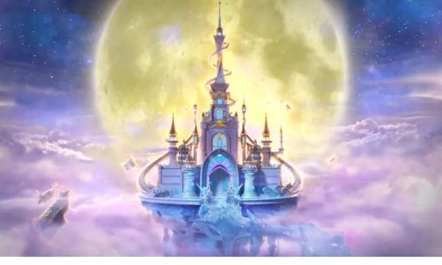巨大的黄色明月犹如一块淡黄色宝石 光泽明亮动人 笼罩在一座精致华丽的城堡 周围弥漫着粉色的云雾 一切都美得不像现实 像极了一幅美不胜收的画卷