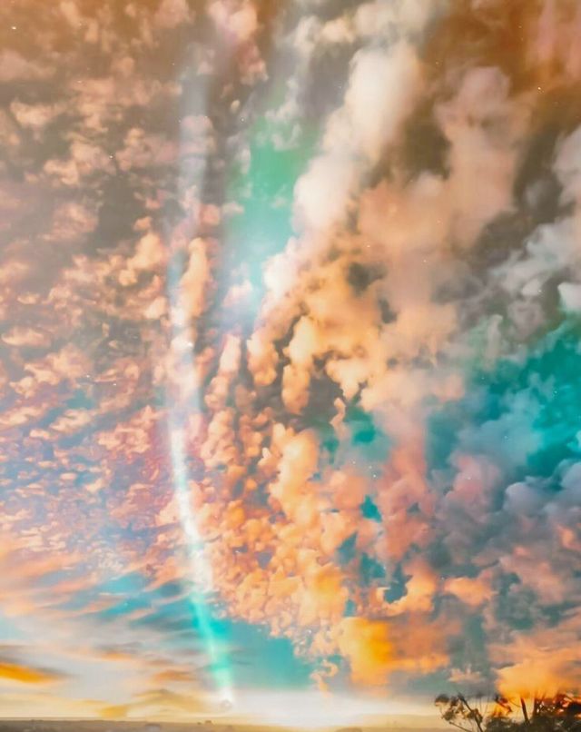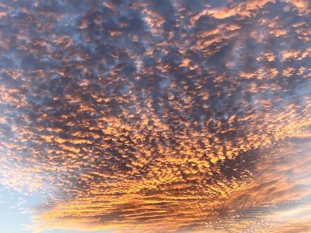 夕阳余晖映的天空蓝中带抹出几许亮橙色,甚至还反光一道亮光,云层的点状层次感随着风动,若隐若现出未完全褪去的,属于白天的光景