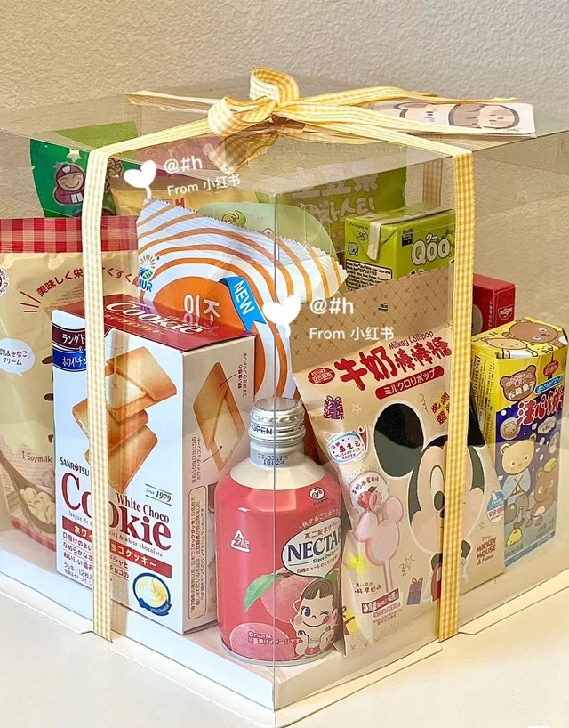 撕开外面的包装纸后,里面是一个透明的蛋糕盒子上面用黄色的丝带打着蝴蝶结,丝带里面夹着一张黎洛依照片的明信片,蛋糕盒子里面装的是满满登登的零食