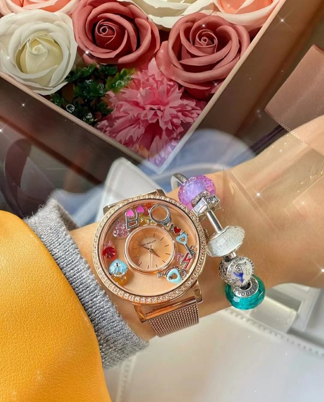 拆开包装,里面是一个装满玫瑰花的盒子,盒子里面躺着一个玫瑰金色的手表。