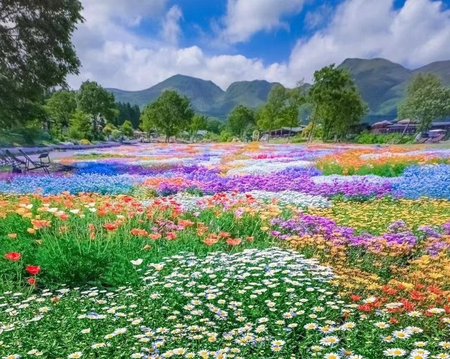 两人依偎在花海,看着眼前的儿女嬉笑打闹。