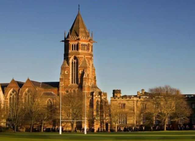 几棵矮树簇拥着有着悠久历史的紫藤学院