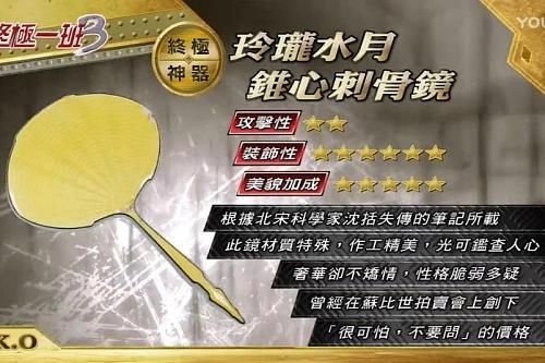 武器:玲珑水月锥心刺骨镜(曾经在蘇比世拍卖会上,创下「很可怕,不要问」的价格。)