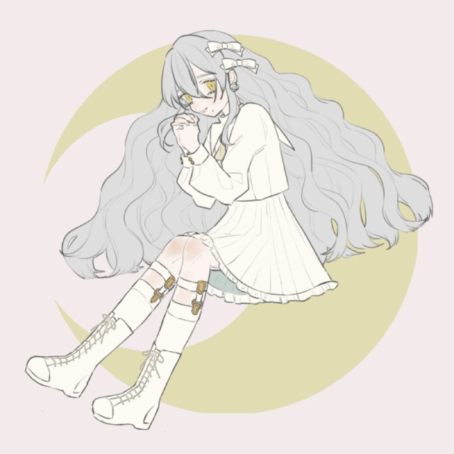 【衣着】头左侧戴着黑色蝴蝶结,上衣是白色水手服,黄色的领结,下身穿着白色未过膝,有着裙尾有着白色花边的裙子,白色长袜未过膝,穿着淡灰色马丁靴