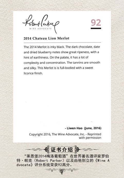 子辰(手下)莱恩堡2014美乐干红葡萄酒获得帕克团队评分92分(2016年)