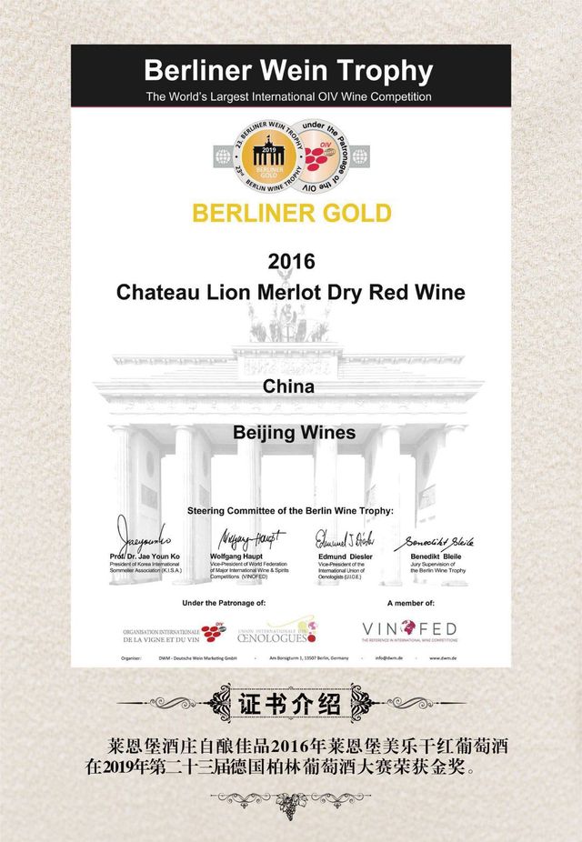 子辰(手下)莱恩堡2016年美乐干红葡萄酒获得2019年德国柏林葡萄酒大赛-金奖