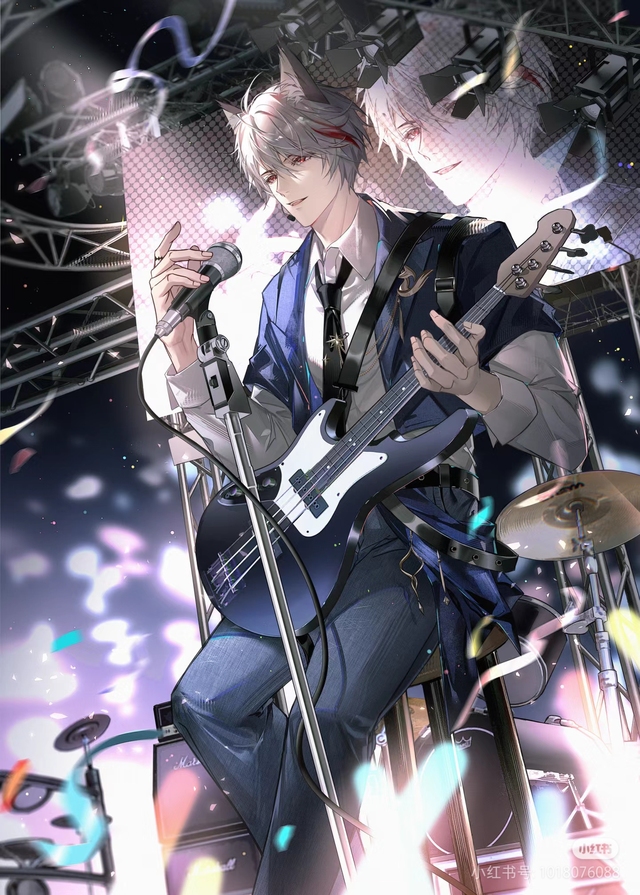 海报里的少年一只手轻握麦克风,另一只手上还拿着吉他,一身西装打扮显得尤为活泼少年。