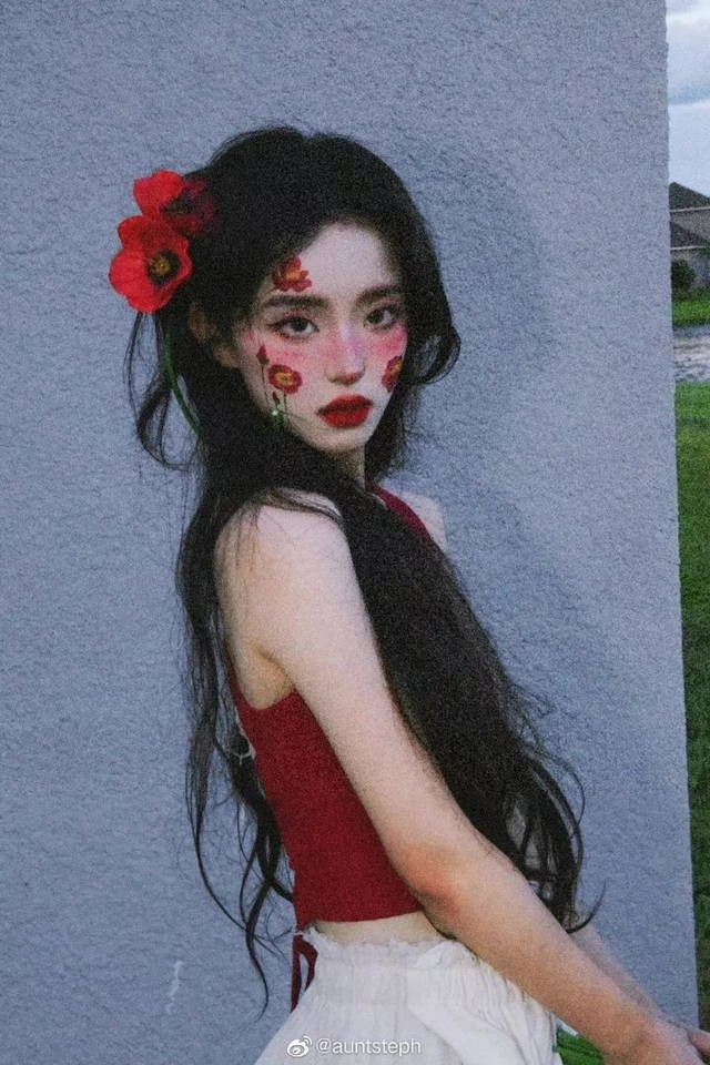 她的脸上还画着娇媚的虞美人
