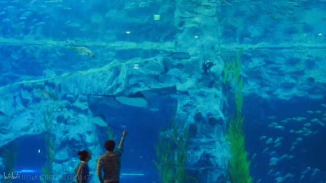 Aphro 趴在透明玻璃窗前看着近在咫尺的鲨鱼,忽然肩膀被拍了一下,女孩回头。M.J.举着拳头,“猜猜我手里有什么?”