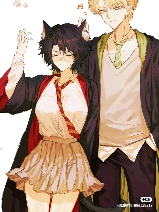 德拉科凑到哈利身后去摸她的猫耳朵。