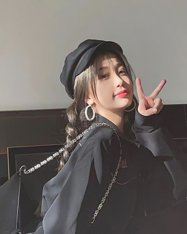 当然啦,作为团里最漂亮的女孩儿,拍MV也要美美的,她就穿了一件黑色外套加黑色百褶裙,还有黑色的贝雷帽,梳着双三股辫,特别的好看。