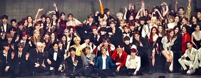 今晚所有的表演者都在台上,KDA夹在BTS和EXO中间