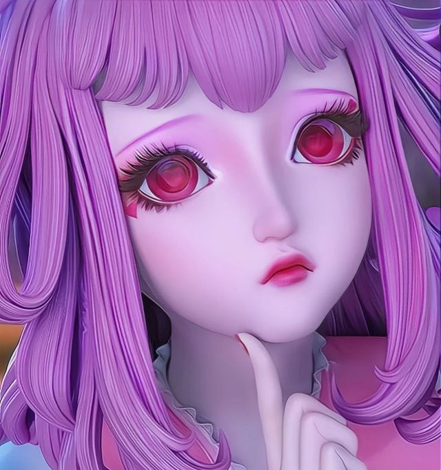 温柔的瓜子脸,肤色白里透红。红色的眼睛中瞳孔都是爱心的模样,眼角旁有些爱心形状的粉色眼纹。