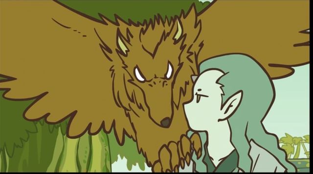 紫色火焰中突出一个绿色皮肤的人影,就看到一个狼鹰不小心站在了这个人肩膀上。