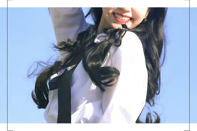 她上衣身着白色短袖小衬衣,下身穿着件浅蓝色的短款牛仔裤。脚上配了一双小白鞋。既清爽又可爱,像是邻家的小妹妹一样。
