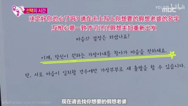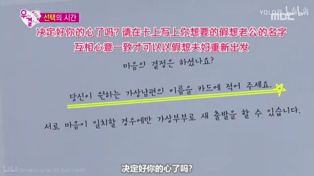 “决定好你的心了吗,请在卡片上写下你想要的假想老公名字,互相心意一致才可以以假想夫妻重新出发。”刘仁娜看着任务卡缓慢说道,唸完才点头表示:“ok!”