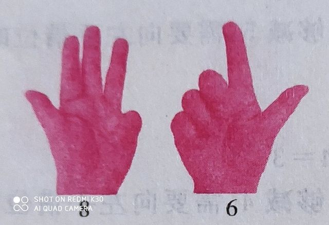 99连续减6,如果右手不够减6,需要向左手借位时,左手减少一个表示10的手指,右手则应增加一个4。