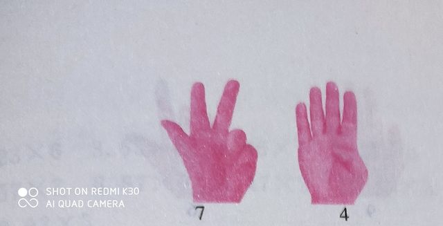 [解题过程]第一步:74的十位数70用左手表示,74的个位数4用右手表示,如下图所示。