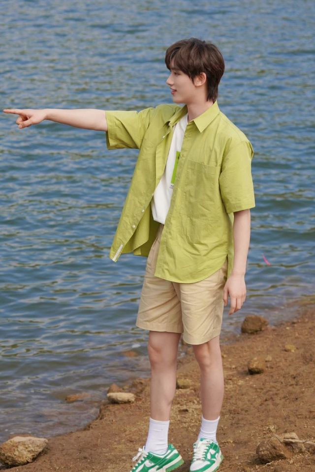 丁哥穿的很日常,白色半截袖搭配绿色外套,大概是这样