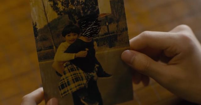 那是庄文杰小时候,父亲背着自己。只不过庄文杰父亲的脸已经被划掉了。