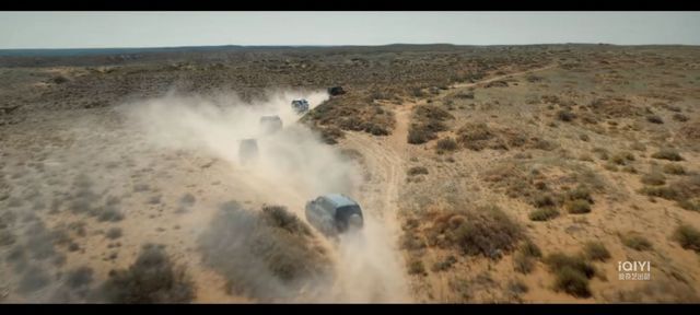 一辆辆汽车飞驰而过,掀起来一堆风沙飘飞着,在这广阔无垠的沙漠中他们显得渺小……