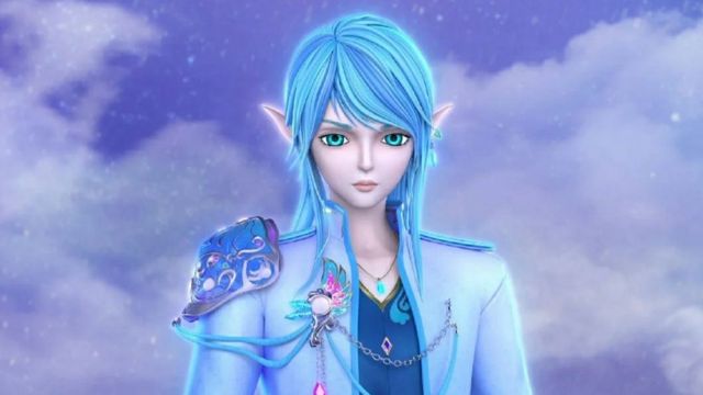 蔚蓝的头发,湖绿色双眉,头上戴着蓝色宝石点缀的银质头饰,尖尖的精灵耳彰显着他水之精灵的身份