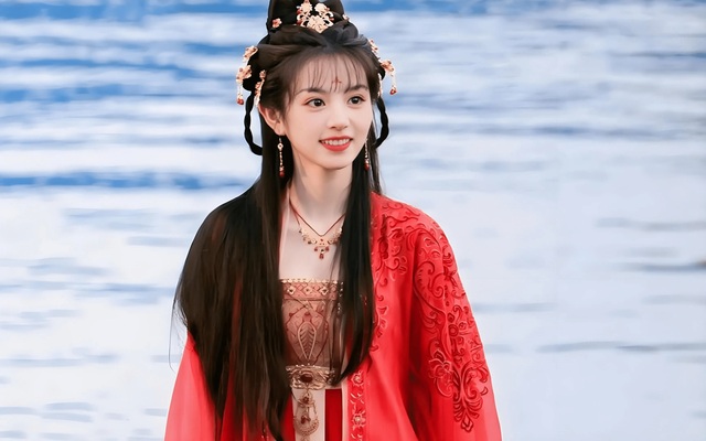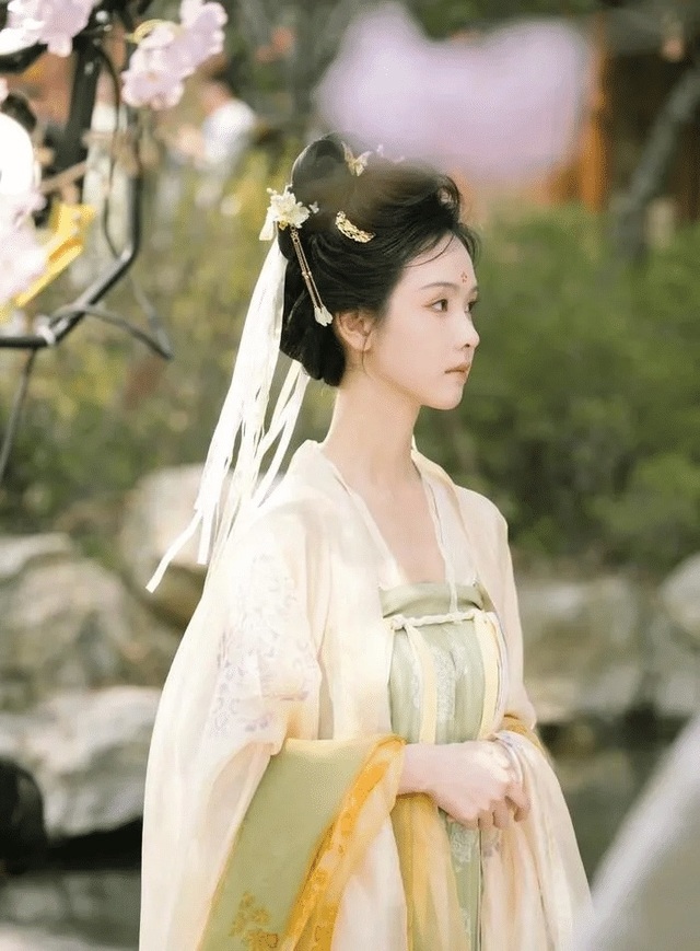 外罩一件浅碧色轻容纱半臂,臂上搭着同色系的披帛,更添几分飘逸。