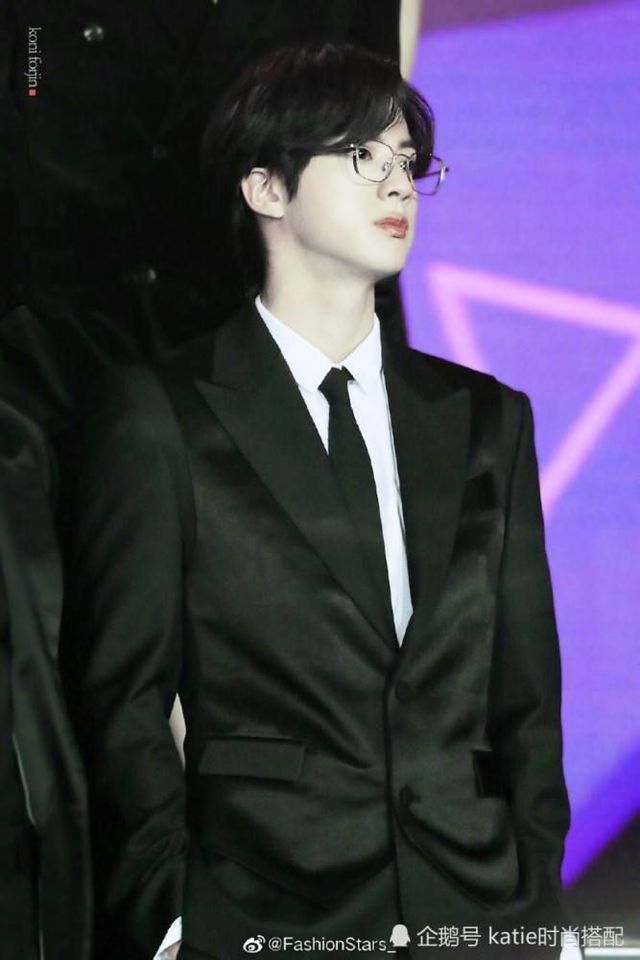 金硕珍身穿得体的黑色西装和白色内衬,脸上还有个金丝框眼镜,一幅温文儒雅的公子哥的形象