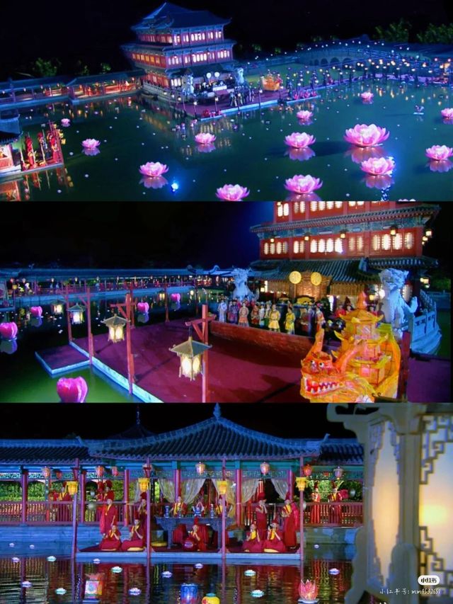 夜晚的河边热闹非凡,各式各样的红灯笼高高挂着,河面上漂满了花灯。