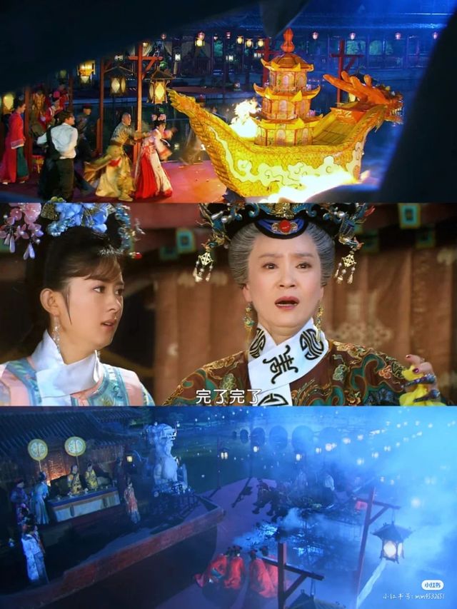 不知道怎么回事,人群中传来一声尖叫。有什么东西腾空而起,落在老佛爷的法船上,紧接着法船起火了。人群出现了慌乱,永琪忙护着欣荣躲到安全地带,晴儿则劝慰着老佛爷。