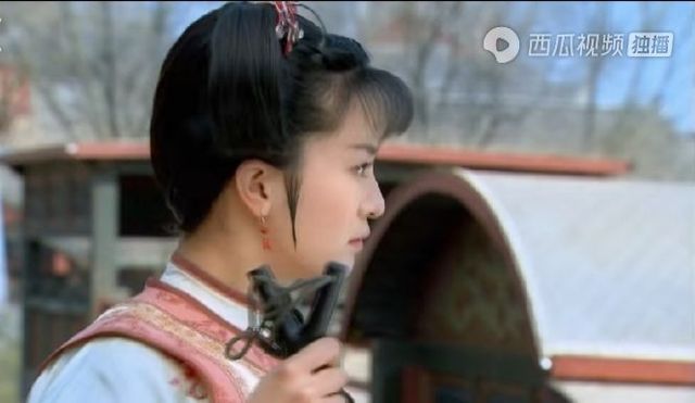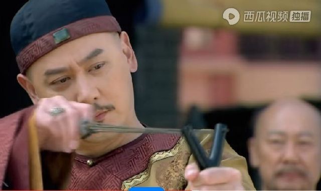皇上将手中的扇子递给一旁的随从,接过小燕子手里的弹弓。
