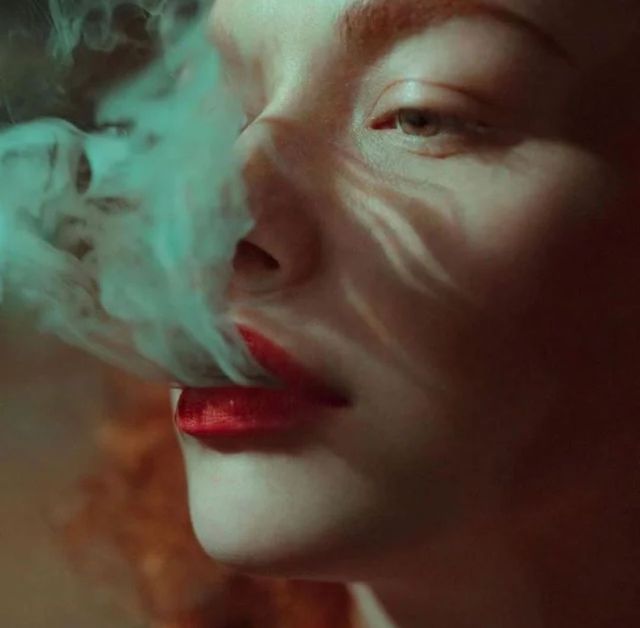 细长白皙的食指和中指尖夹着香烟顶端的滤嘴凑近红唇,轻轻嘬一口,烟雾飘散在空中,专属于尼古丁的味道弥漫着。