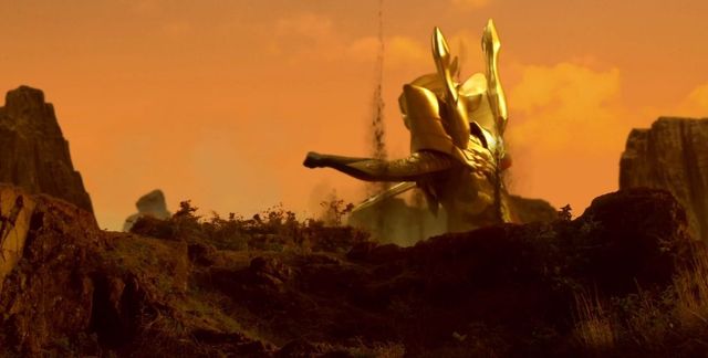 身穿银色铠甲的巨人左臂握拳直起,拳头尽头是被击飞在山丘对面的纳克尔星人。