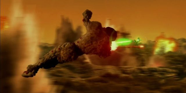 赛罗侧身飞起,头部的光束灯发射簇绿色光线;纳克尔星人同时举起手里的枪飞身上前和他对峙