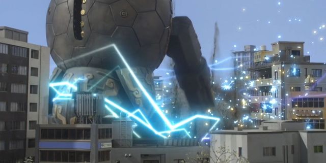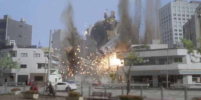 怪兽卢迪安穿越市区——市民们纷纷四散奔走,所经之处的建筑物皆被暴走的怪兽摧毁