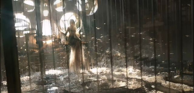 恩莉尔唰地一下拉开了床帘——光着脚往纱帘透光处跑去,纤细的指尖从黑暗中脱出,沐浴在点点塔光下;少女微不可查的舒了口气,背对着光芒坐在了自天花板垂下的秋千上。