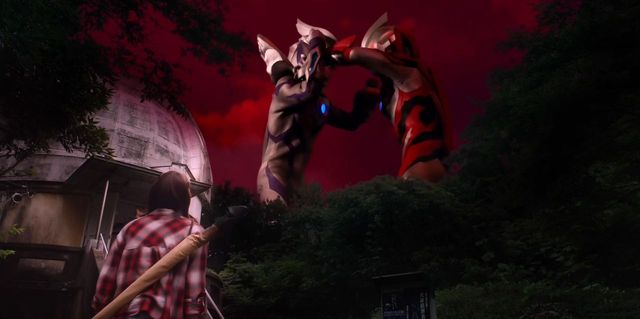 捷德的回旋踢将赛罗踢翻倒地,成熟的红黑巨人站在捷德身旁,对他的做法表示赞许