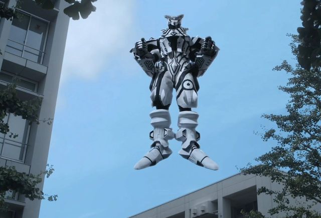 条纹状,带着头盔的三面怪人达达看到了这幕,操控着被涂装过的军团机械人出现,试图争夺猎物。