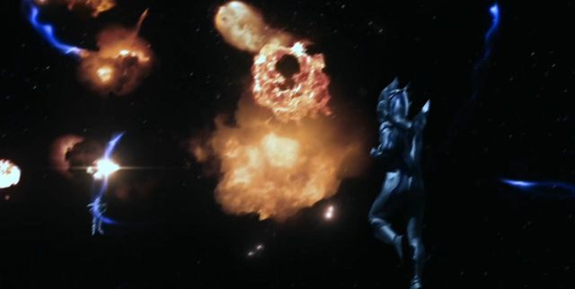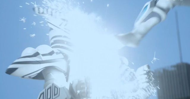 机械人发出的炮弹被无限赛罗的头镖抵挡。