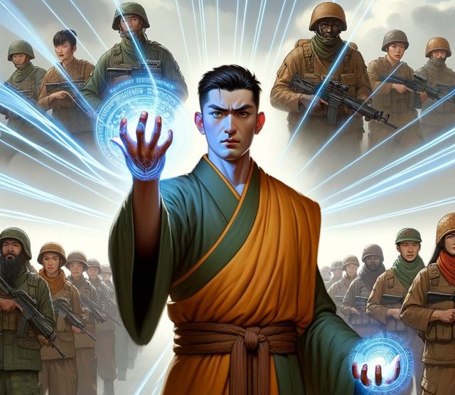 在这场充满着神圣色彩的战斗中,法海站立在后方的高地上,双手合十,面容庄严。他的双眼紧闭,心中默念着梵音,周围环绕着淡淡的金光,仿佛将他整个人都包裹在一个神圣的光环之内。每当他的嘴唇轻轻动弹,一道道金色的光芒便从他的身体中散发出来,这些光芒如同有生命一般,在空中飘忽不定,然后准确无误地找到前线战士的身上。