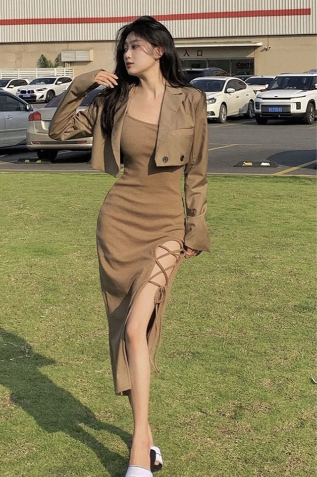 他们就看见一个穿着显身材卡其色鱼尾连衣裙的女人骄傲的向他们走来