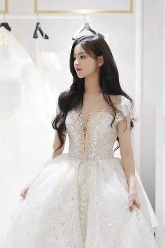 少女站在聚光灯下,乌发垂在白色的长裙边,裙子上的亮片闪闪发光,好像从天而降。